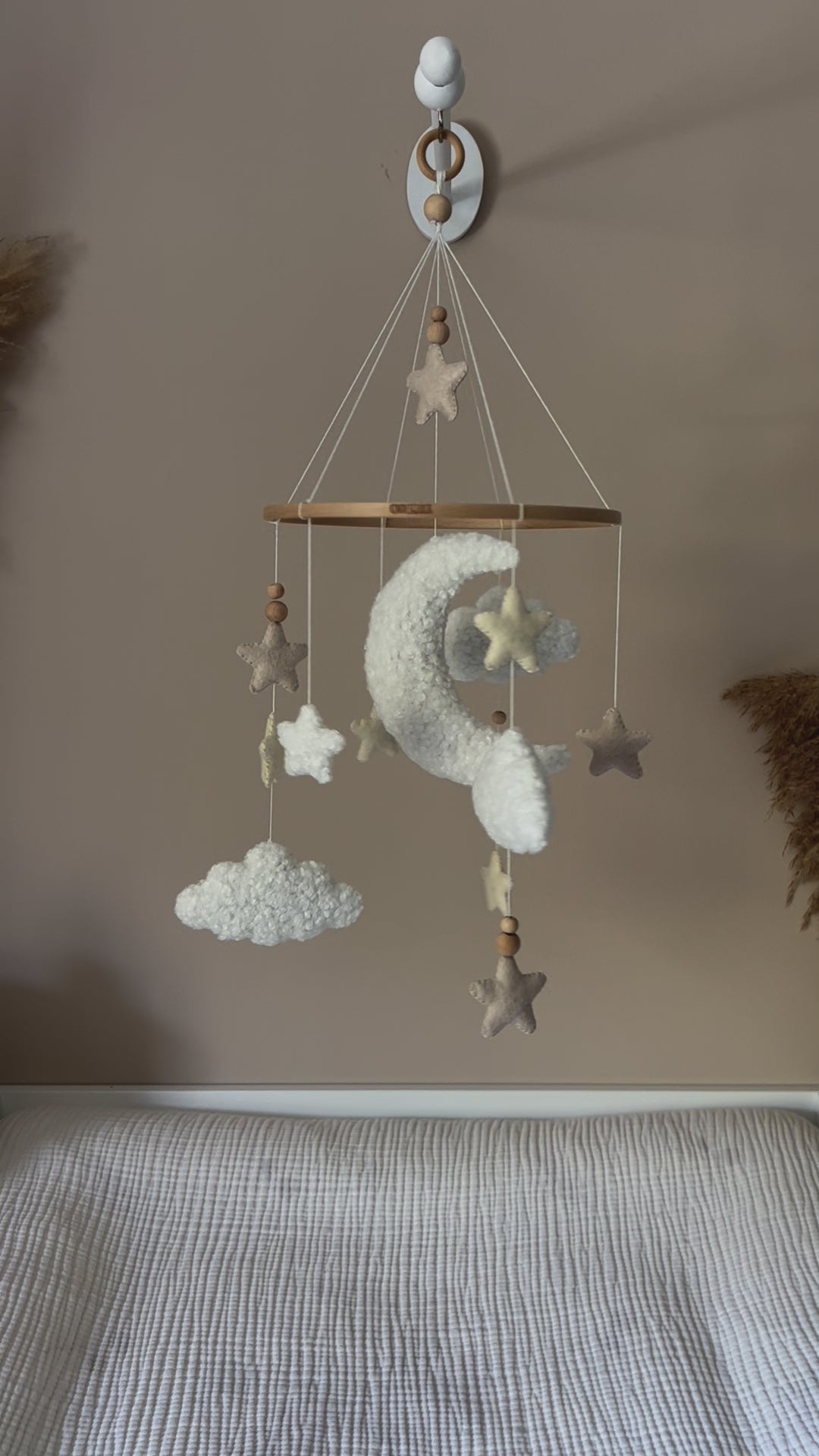 Dieses liebevoll handgefertigte Baby-Mobile ist ein wahrer Hingucker im Kinderzimmer und sorgt für eine beruhigende Atmosphäre. Das Design kombiniert aus weichem Bouclé-Stoff mit dekorativen Elementen aus Filz wie einem Mond, funkelnden Sternen und sanften Wolken. Die harmonischen Naturtöne und die sanfte Bewegung der Figuren laden Ihr Baby zum Träumen ein.