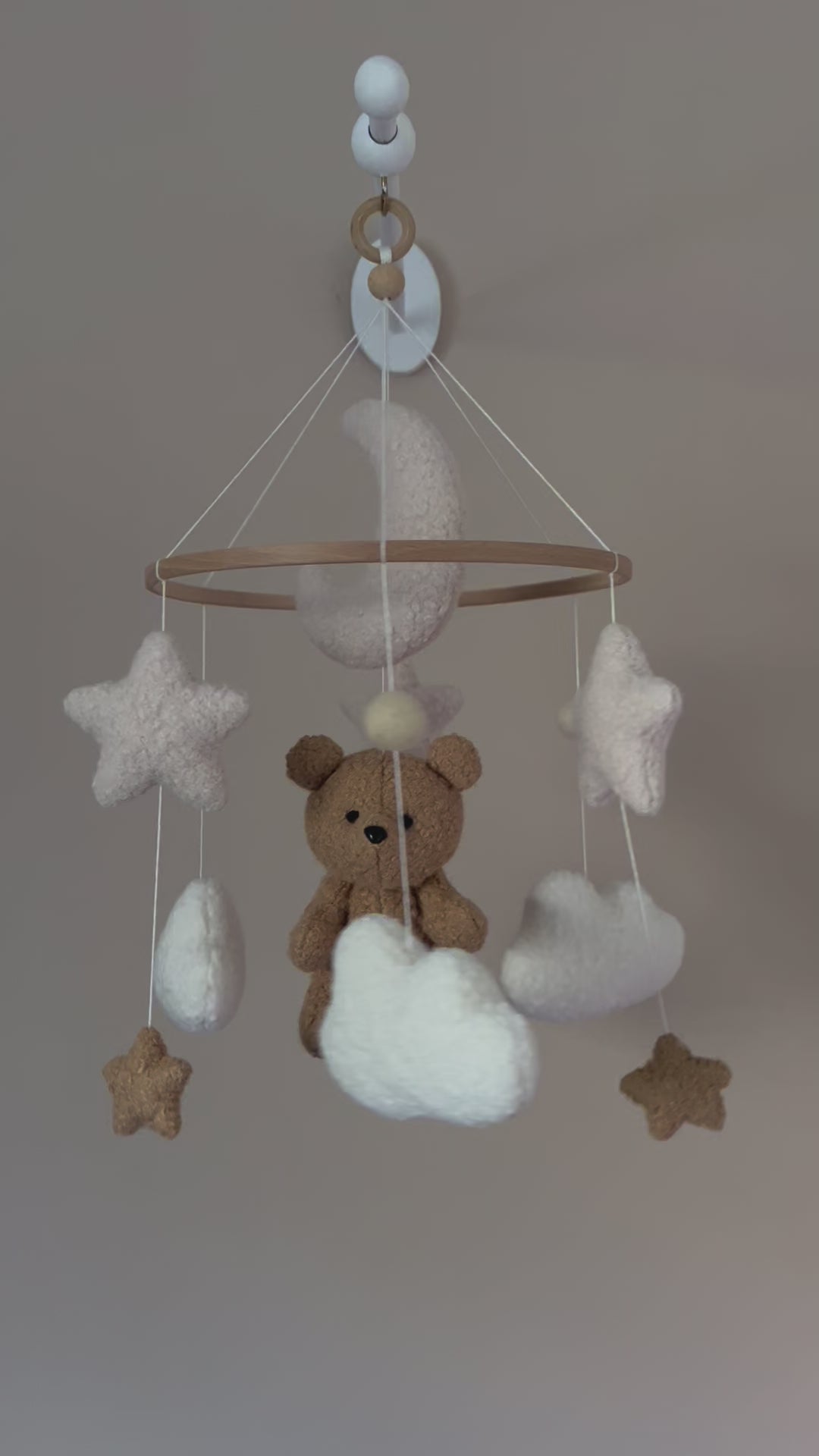 Dieses traumhafte Mobile kombiniert einen kuscheligen Teddy, einen zarten Mond, Wolken und Sterne – alles aus weichem Bouclé handgefertigt. Die natürlichen Farben und die beruhigenden Bewegungen machen es zur perfekten Ergänzung für die Wiege oder den Wickeltisch. Mit seinem zeitlosen Design fügt sich das Mobile harmonisch in jedes Kinderzimmer ein und schafft eine beruhigende, friedliche Atmosphäre. Eine wundervolle Geschenkidee für frischgebackene Eltern! 🎁💕